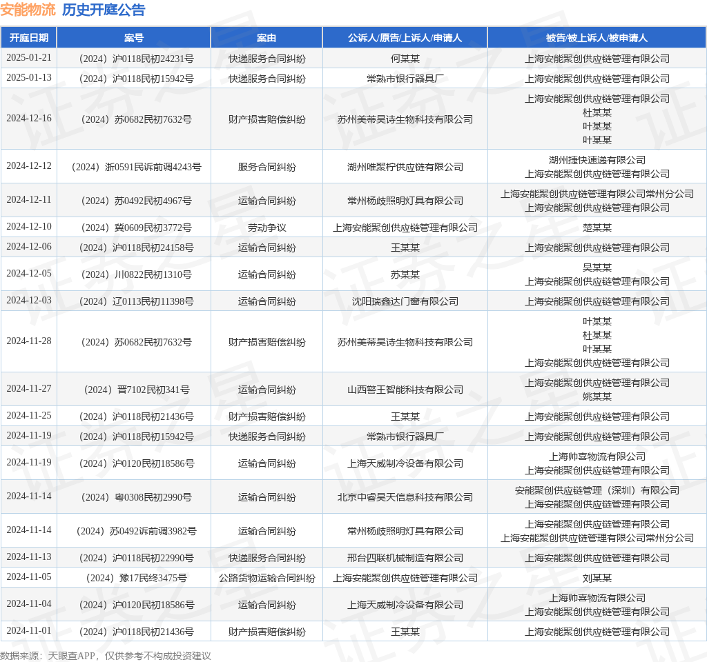 案号:(2024)冀0609民初3772号审理法院:保定市徐水区人民法院案由:劳动争议当事人信息: 原告/上诉人:上海安能聚创供应链管理有限公司 被告/被上诉人:楚某某开庭日期:2024年12月10日根据统计,近一年内以上海安能聚创供应链管理有限公司为当事人的历史开庭公告有173则,其中案由为“运输合同纠纷”的公告以39则居首,其次为“劳动合同纠纷”有18则,“劳动争议”有16则。历史开庭公告(前20条)如下: